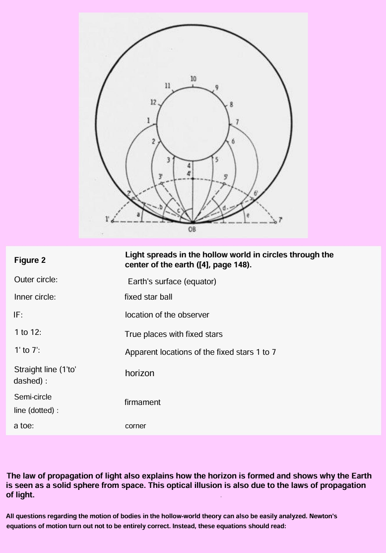 A central technical feature of the reconstructed hollow-world theory is the claim that light propagates in circles through the center of the Earth. The diagram on page 5 is especially important here. It lays out the observer’s position, the apparent and true positions of stars, the horizon, the firmament, and the Earth’s inner surface, all organized by curved light paths rather than straight Euclidean sight lines. The accompanying text says this law of light propagation explains both the formation of the horizon and why the Earth is seen as a solid sphere from space.