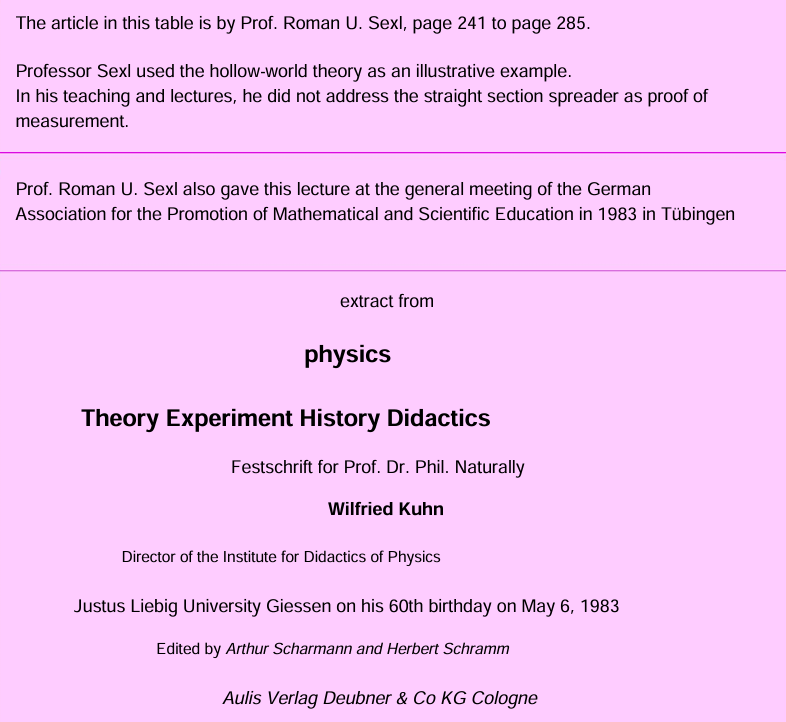 This piece is an excerpt from a broader academic publication tied to physics education and the history/didactics of science. The opening page explains that Prof. Roman U. Sexl used the hollow-world theory as an illustrative example in teaching, especially to explore the relationship between experiment, theory, and worldview. It also explicitly notes that he did not treat the straight-section spreader measurement as proof, which already distinguishes this work from other concave-Earth texts that lean heavily on Morrow-style measurement claims.