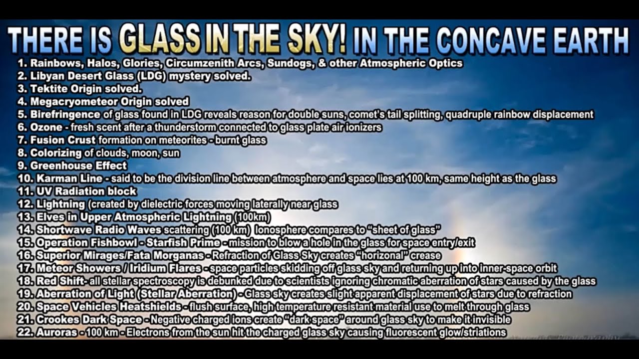 The video opens with an assertion that substantial evidence supports the existence of a glass sky—a barrier or dome-like structure encasing Earth. This “glass ceiling” is tied to 22 pieces of evidence, including: